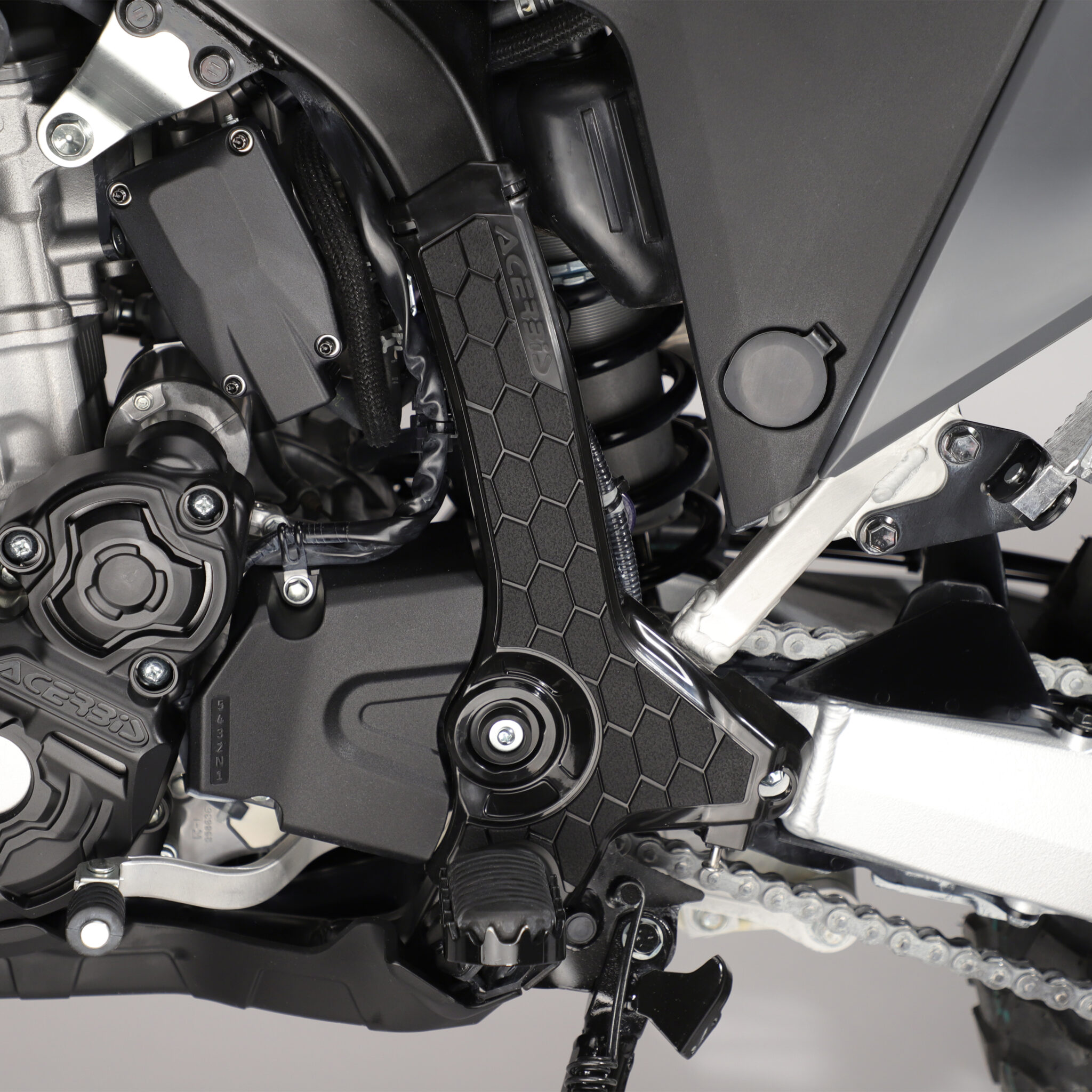 Acerbis stel beskytter er udviklet til at beskytte stellet i de mest udsatte områder, samtidig med at den forbedrer grebet mellem fører og motorcykel. Den reducerer slid fra støvler og knæ og bidrager til bedre kontrol under både offroad- og adventurekørsel.