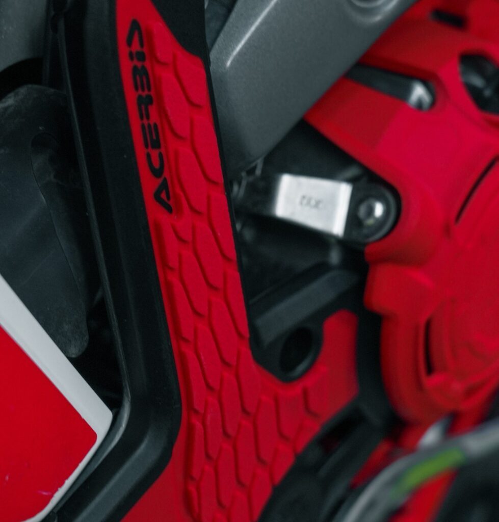 Acerbis stelbeskytter er udviklet til at beskytte stellet i de mest udsatte områder, samtidig med at den forbedrer grebet mellem fører og motorcykel. Den reducerer slid fra støvler og knæ og bidrager til bedre kontrol under både offroad- og adventurekørsel.