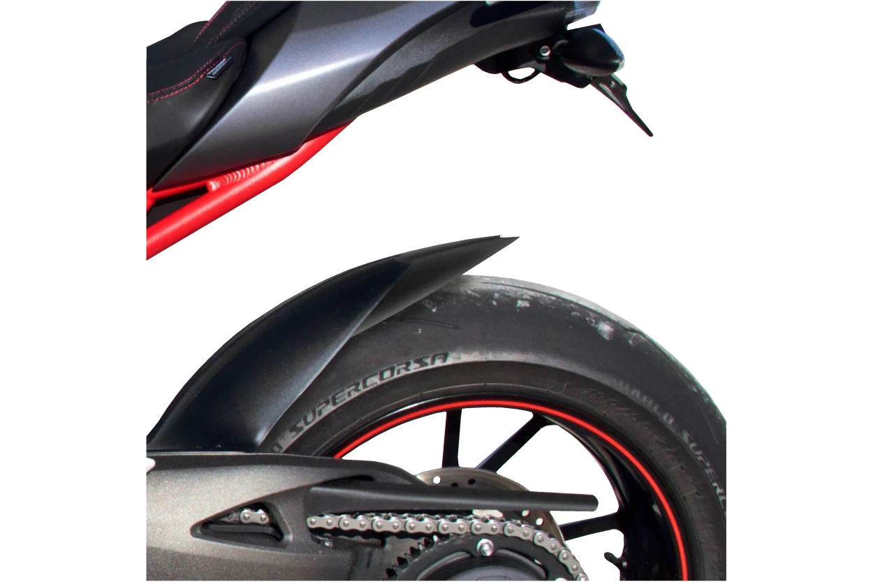 Puig bagskærmsforlænger beskytter motorcyklens bagende mod vand, mudder og sten, der slynges op fra baghjulet. Den reducerer snavs og fugt på affjedringen og førerens ryg, hvilket giver en renere og mere komfortabel køreoplevelse – især under våde forhold.